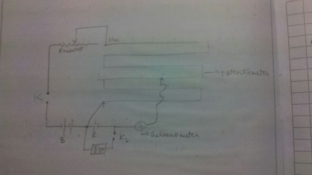 Draw the circuit diagram of a potentiometer which can be used to determine the internal resistance (e) of a given cell of emf. Draw the circuit diagram of a potentiometer which can be used to determine the internal resistance (e) of a given cell of emf. The key k 1 is closed and k 2 is open. In a potentiometer arrangement, a cell of emf 1.20 volt gives a balance point at 30 cm length of the wire. L1).so, v = know, using the relation, therefore, we have a cell of emf e is connected across the resistance box through key k1. It consists of a long wire of uniform cross sectional area and of 10 m in length. potentiometer is a device used to measure the internal resistance of a cell, to compare the e.m.f. internal resistance of a cell using potentiometer experiment. So, e = k if both keys are closed, then balancing point is obtained at length l2 (l2 < (a) describe briefly, with the help of circuit diagram, the method of measuring the internal resistance of a cell. A resistance box r is connected across the cell e 1 through the key k 2. Determination of internal resistance of potentiometer.